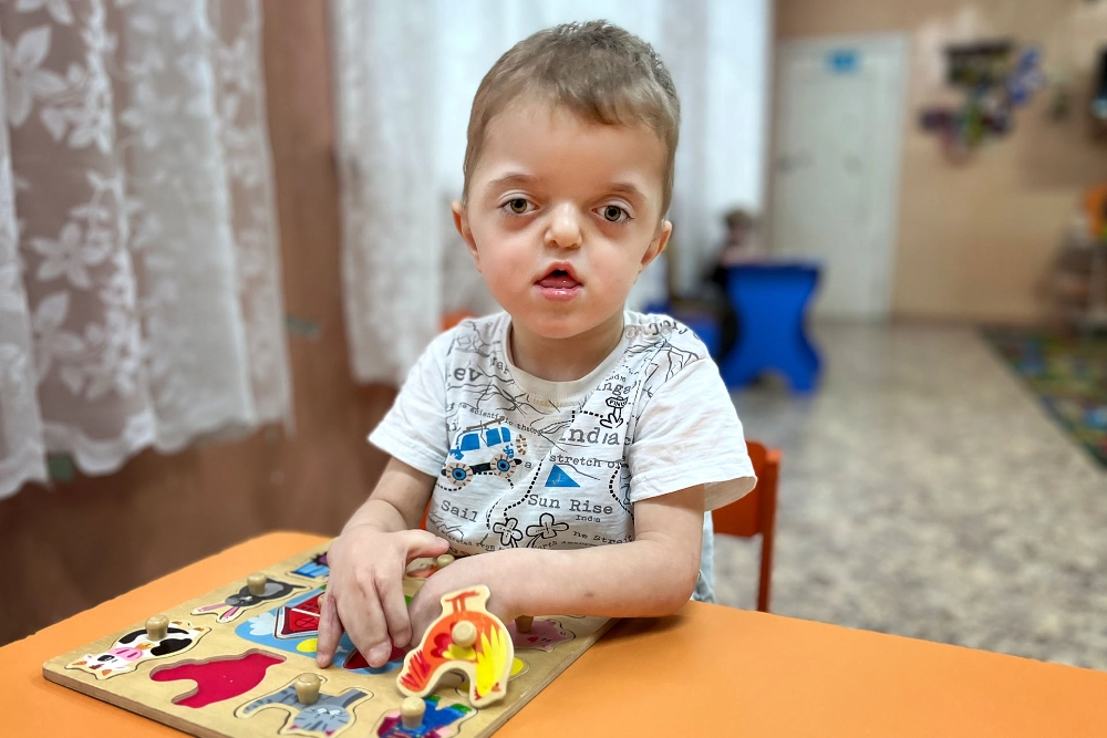 Это означает, что у мальчика деформированы череп и лицевые структуры, недоразвита верхняя челюсть, срощены «лопаточкой» пальчики на обеих руках. Особенно опасна деформация черепа: кости давят на растущий мозг, из-за чего повышается внутричерепное давление. Вова уже сейчас страдает от головных болей, особенно реагирует на погоду — становится в эти дни плаксивым, беспокойным. По этой же причине у него снижено зрение. А из-за маленькой челюсти Вова так и не начал говорить — у него в обиходе только отдельные звуки. Он не может жевать, есть грубую пищу, ему дают всё перетёртое.