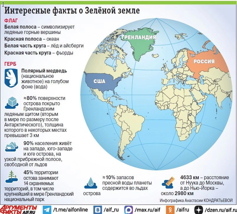 Гренландию называют царством льда и снега — это гигантский остров, на котором ледяной щит толщиной до 4 км покрывает 81% территории. Читайте в справке aif.ru, почему остров получил такое не соответствующее его современному облику наименование, которое в переводе с древнескандинавского означает «Зеленая земля».