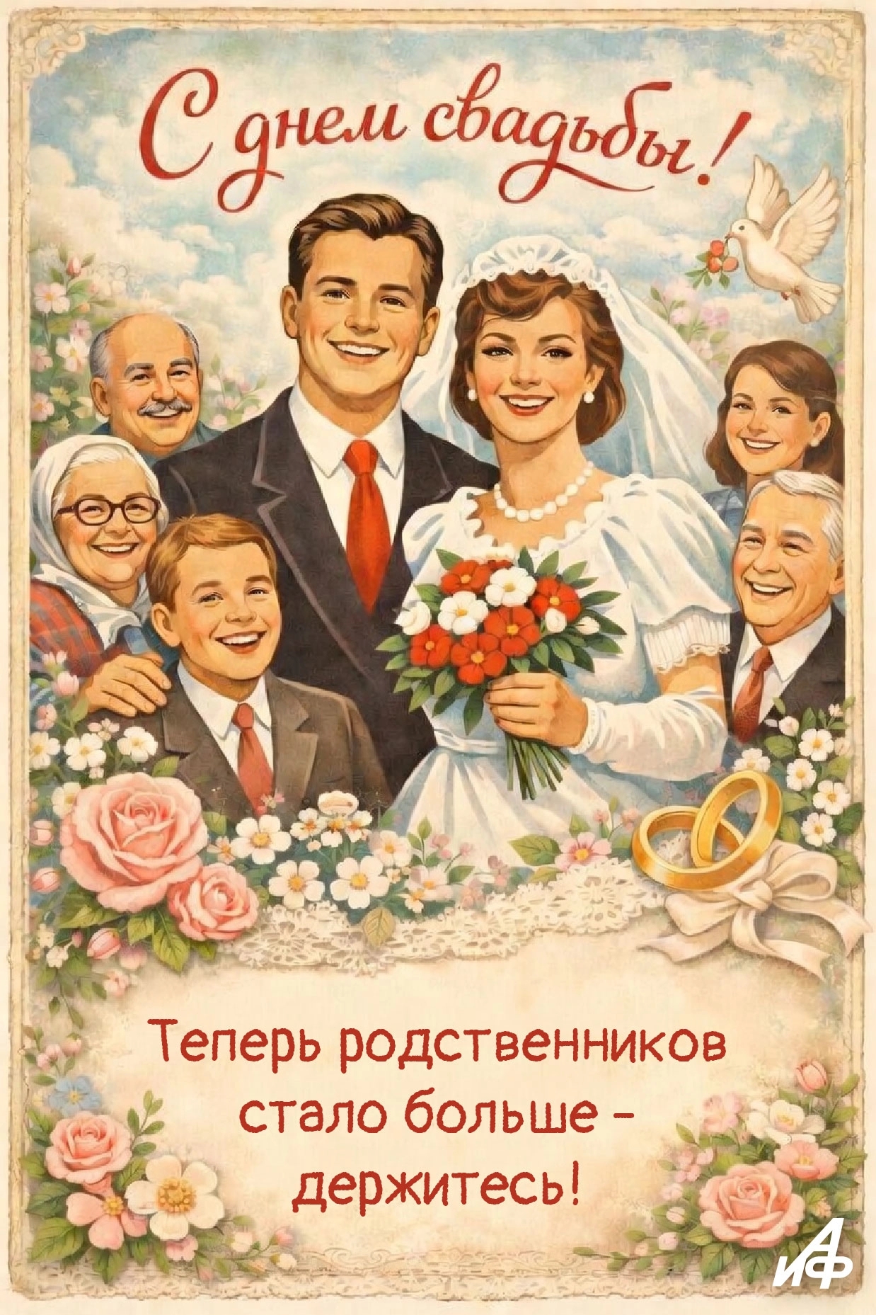 Красивые открытки с яркими образами и важными словами в день свадьбы рассылают мамы и папы новобрачных, а также бабушки и дедушки, тети и дяди, братья и сестры, двоюродные, троюродные и совсем дальние родственники. Вся огромная семья!