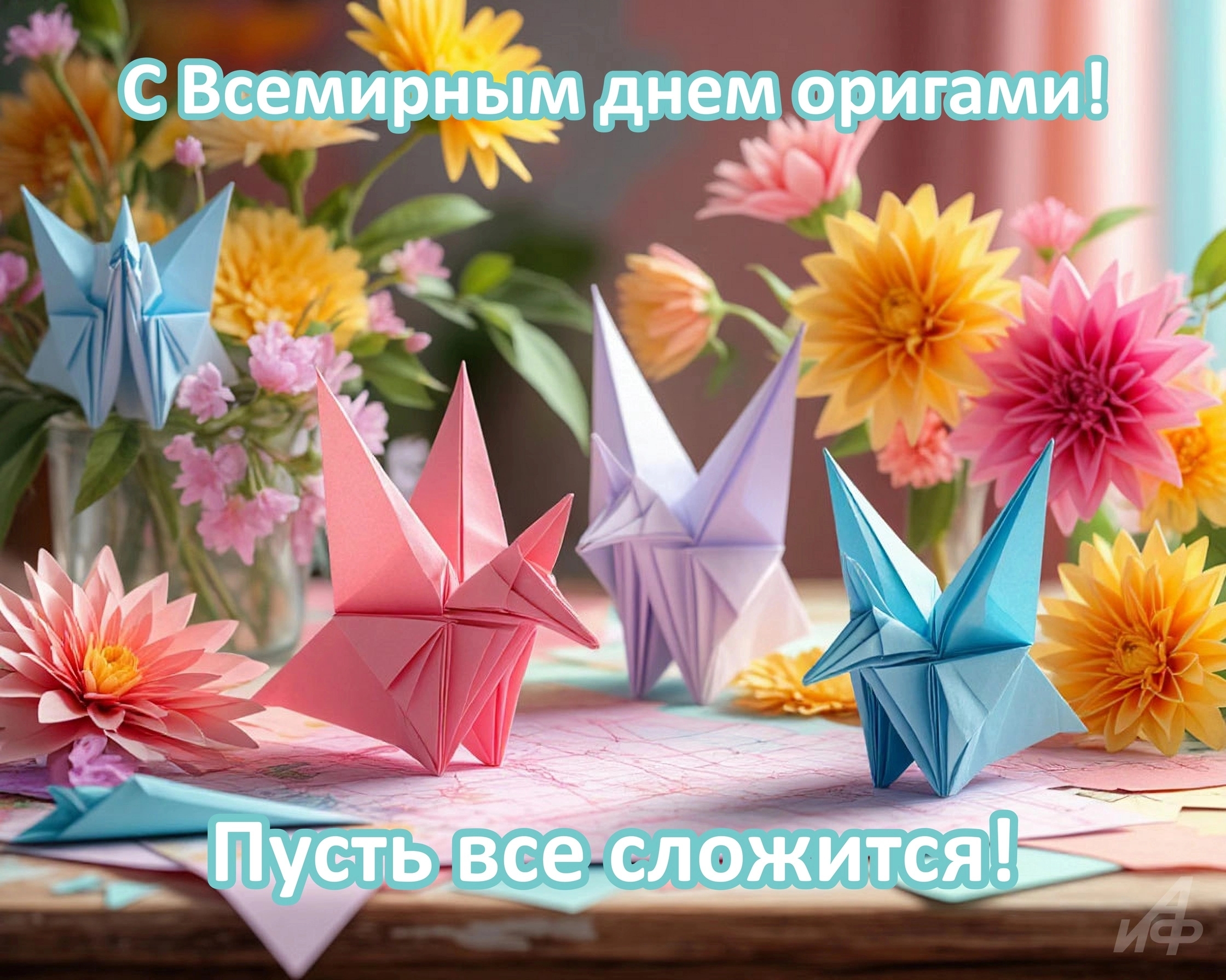 Из простого листа бумаги можно сложить настоящее чудо. Всемирный день оригами отмечается 11 ноября и это отличный повод подарить кому-то бумажное сердце или журавлика. А если не умеете или вам адресат находится слишком далеко, то отправьте эту открытку - там полный набор фигурок на удачу!