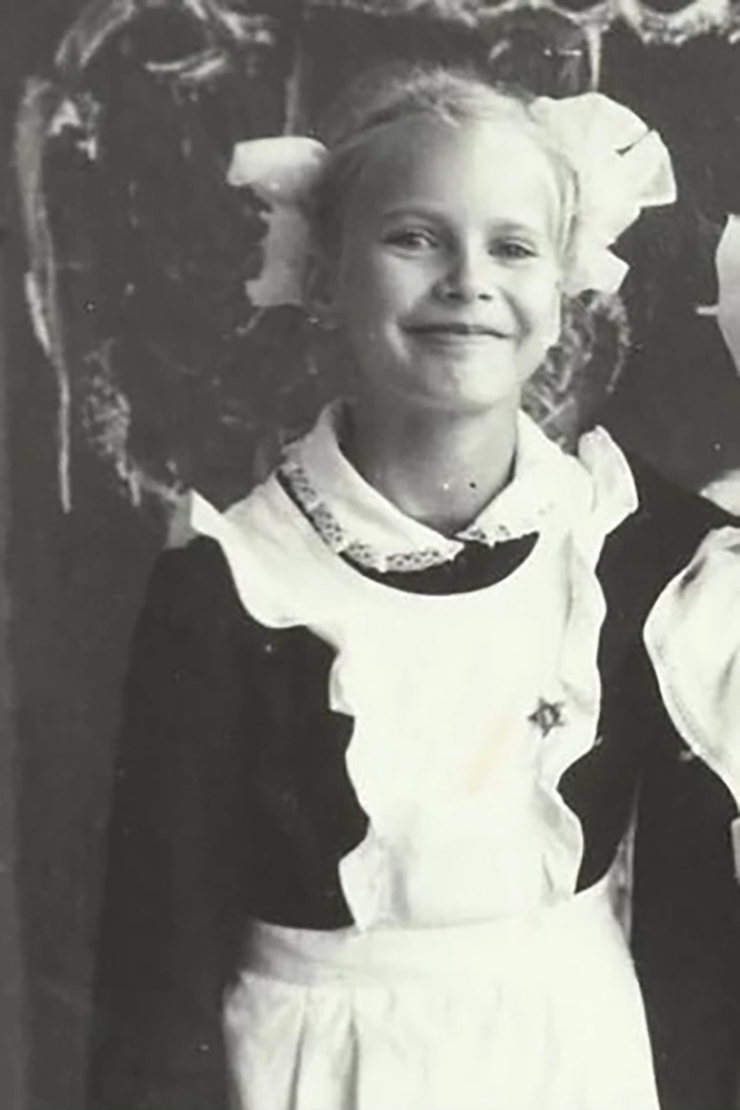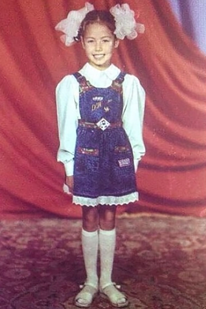 Мастер спорта по художественной гимнастике пошла в школу как раз вскоре после отмены обязательной школьной формы — поэтому у неё такой необычный наряд на школьной фотографии. Она рассказывала, что училась волгоградской гимназии с углублённым изучением английского языка, но воспоминания у неё о годах учебы остались не самые лучшие — одноклассники её травили, а признали лишь после первых спортивных успехов.