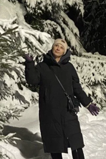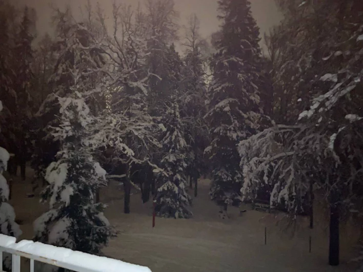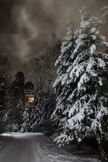 Анна сфотографировала заснеженные ели, в ветвях которых светится уютными огнями домик.