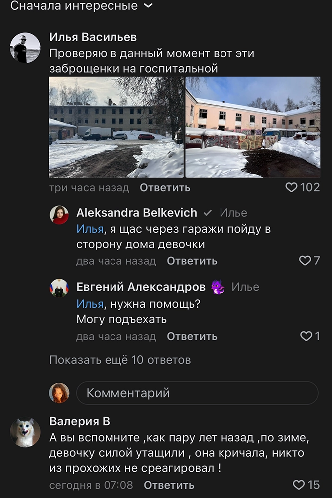 6. На данный момент поиски продолжаются. Полиция проверяет личность мужчины, о котором говорили соседи. Неизвестный «засветился» на камерах видеонаблюдения. Следователи проверяют все версии. По одной из них, Саша могла просто уйти к друзьям, не предупредив об этом родителей. Неравнодушные жители обходят заброшенные дома неподалеку от дома Саши.