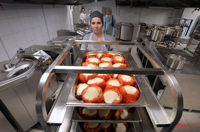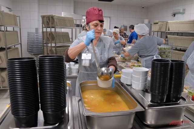 Каждую порцию раскладывают большими половниками и ложками на тарелки, а после отправляют расфасованную еду на ленту для комплектования термоподносов.
