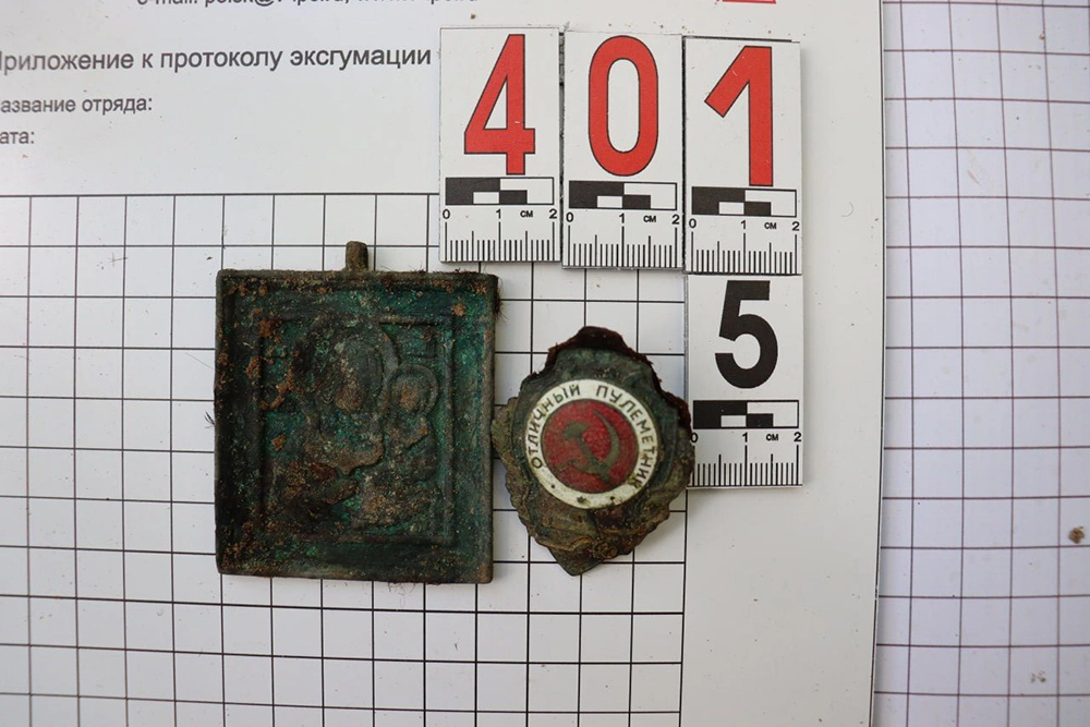 «В этом году мы подняли 196 бойцов, — говорит член Координационного совета „Поискового движения России“ Татьяна Астафьева. — И недалеко от Цветовки, практически в ста метрах от старой Варшавской дороги, там, где во время войны, судя по всему, был немецкий хозяйственный двор, нашли останки пятерых военнослужащих. То, что это наши, уставлено по элементам снаряжения и обмундирования советского образца и личным вещам. Один из погибших привлёк особое внимание — у него на груди сохранился знак „Отличный пулемётчик“. Также у этого бойца была ладанка».