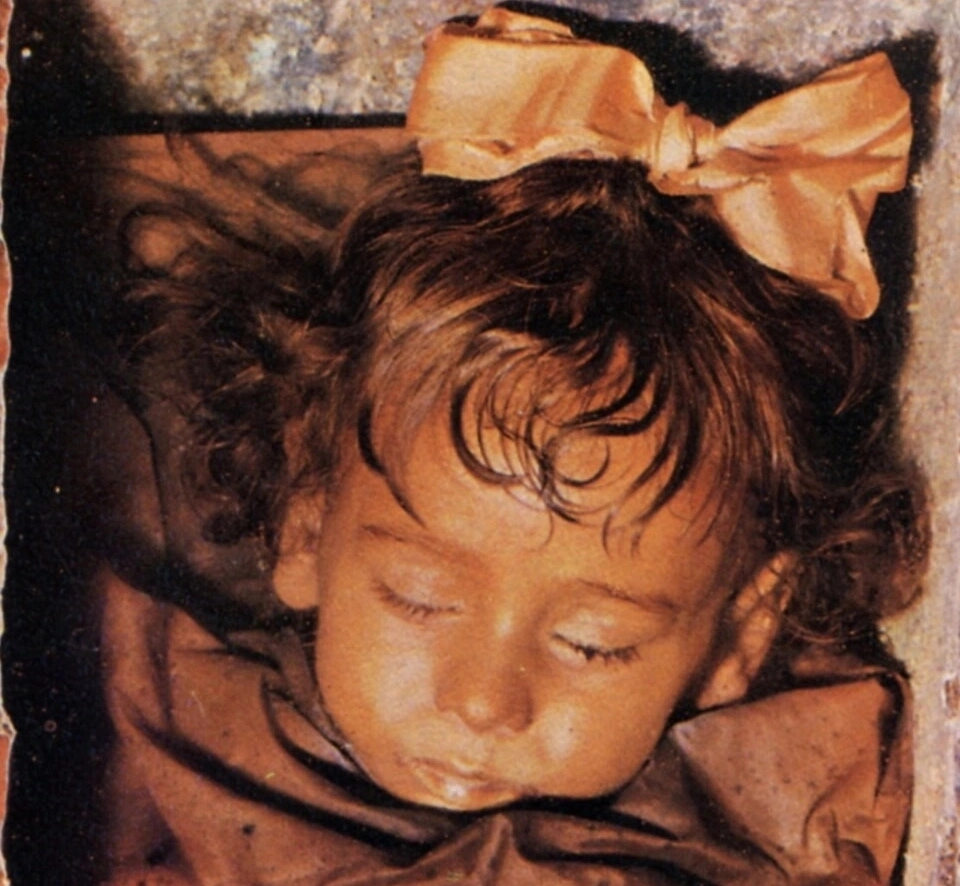 Ещё одна детская мумия, причём, можно сказать, наша современница. Розалия Ломбардо жила чуть более века назад. Она не жертва древнего культа — девочка умерла от пневмонии в 1920 году. Её безутешный отец, не в силах смириться с утратой, обратился к известному химику Альфредо Салафии, который забальзамировал её настолько искусно, что она кажется восковой куклой.