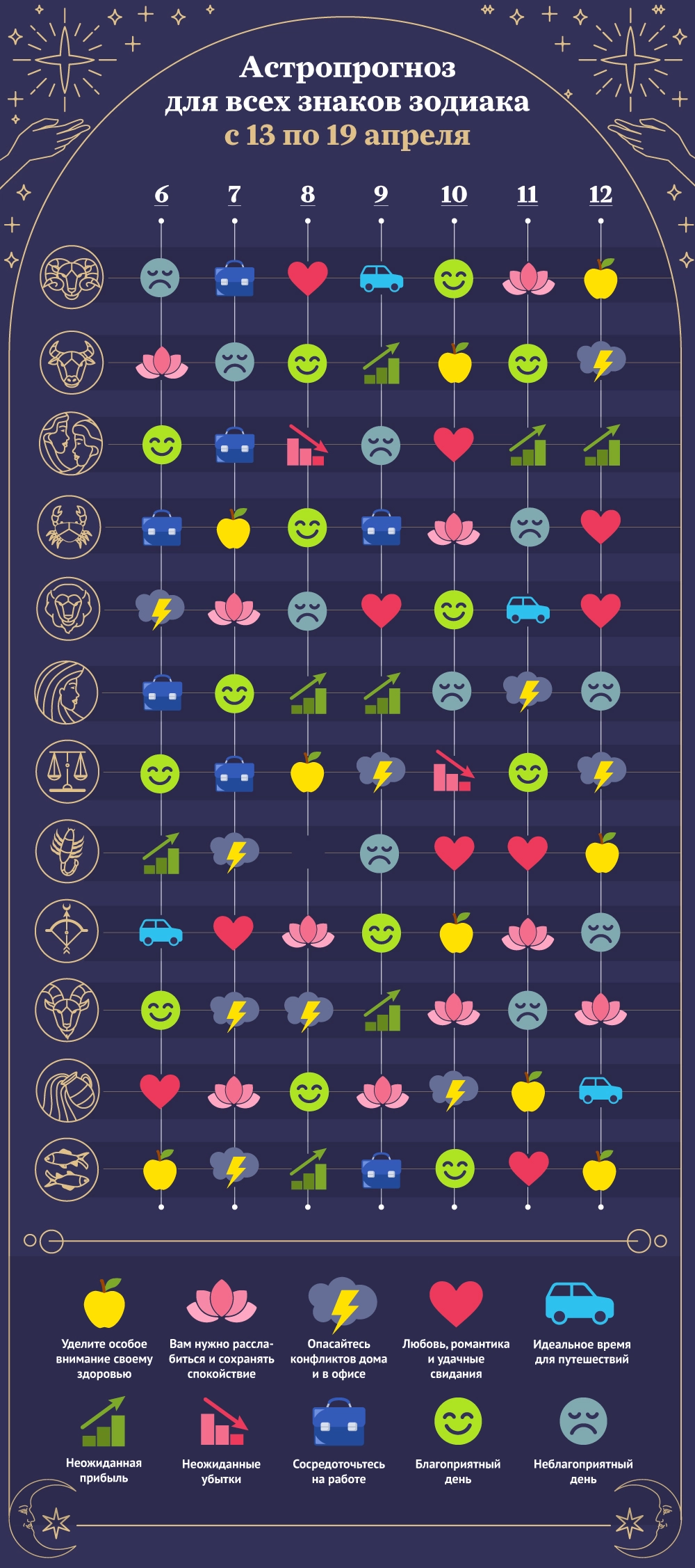 Эта неделя может активировать прекрасные перемены для большинства знаков зодиака. Постарайтесь не упустить свою удачу! Благоприятные и неблагоприятные дни, любовь и отношения, деньги и работа — все подробности в нашем гороскопе.