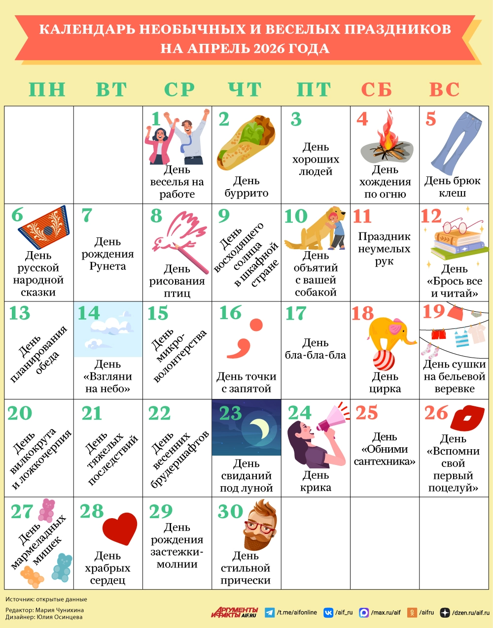 Календарь необычных и веселых праздников апреля 2026 года. Инфографика