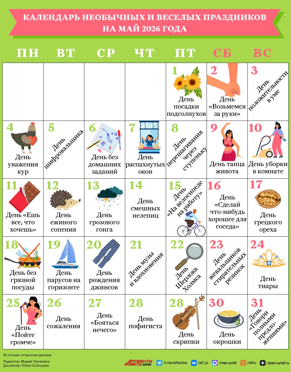 В мае россияне отмечают День Победы и Первомай, но это праздники государственного масштаба, а есть еще множество неофициальных торжеств, которые в течение месяца справляют по всему миру. Мы собрали для вас самые забавные события на каждый день. Все подробности — в инфографике aif.ru.