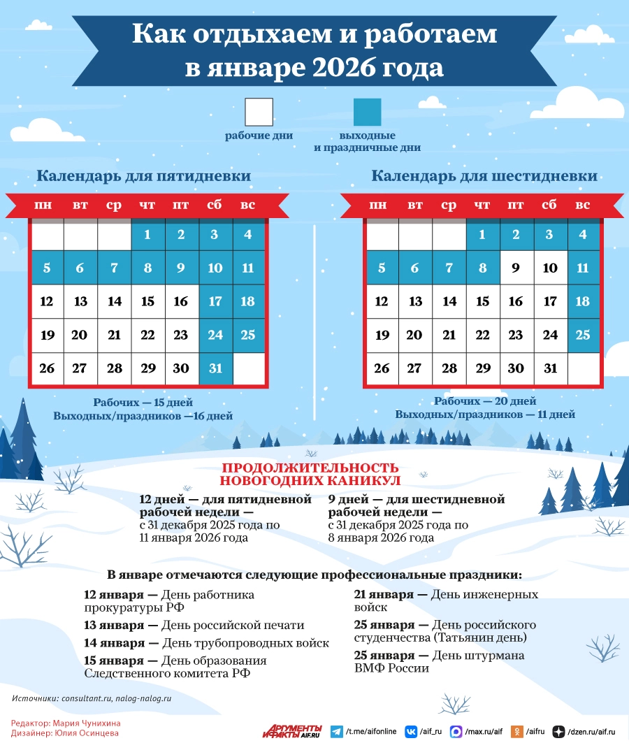 Январь подарит россиянам продолжительные новогодние каникулы и самую короткую рабочую неделю в году. Все подробности — в инфографике aif.ru.