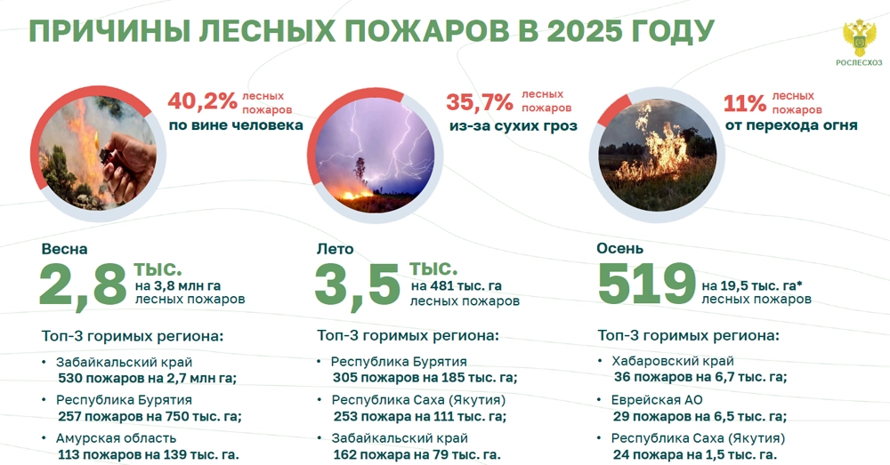 «Результат получился ниже установленного для отрасли на этот год лимита в 4,7 млн га, — отметил глава Рослесхоза. — Из всех возгораний 95% пришлось на пять регионов Дальнего Востока. Антилидеры года: Забайкальский край и Бурятия. На шесть муниципальных образований на границе этих регионов, где нет ни лесозаготовки, ни людей, пришлось 86% затронутой лесными пожарами площади».