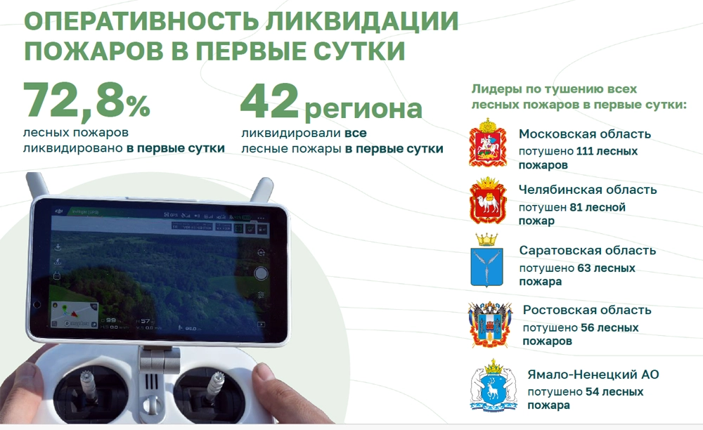 Применение подобных практик уже дало первые результаты в уходящем году, считает глава Рослесхоза. Почти 73% лесных пожаров удалось потушить в первые сутки, не допустив их распространения на большие площади. Это стало возможным благодаря точной и оперативной информации о ситуации в лесу. А в 42 регионах страны и вовсе все лесные пожары этого года удалось ликвидировать в первые 24 часа, похвалил коллег Советников.