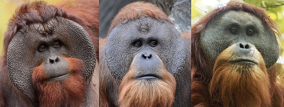 Самцы видов орангутана, слева направо: калимантанский, суматранский, тапанульский. Фото: Commons.wikimedia.org