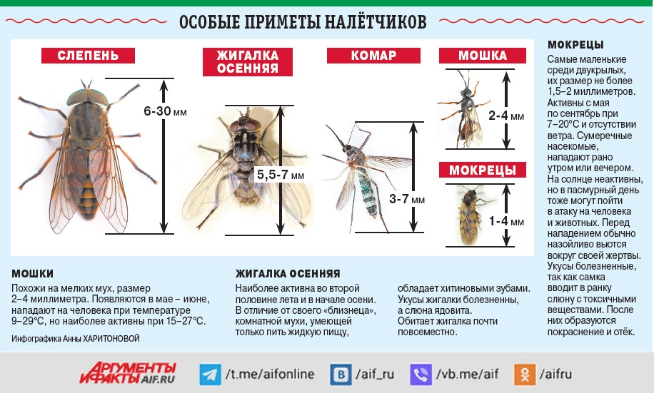 «Кроме хорошо всем известных комаров и слепней, последние появятся к середине лета, в России достаточно широко распространены еще несколько кровососущих насекомых, нападающих на человека, — рассказывает aif.ru известный энтомолог, доктор биологических наук, старший научный сотрудник лаборатории почвенной зоологии и общей энтомологии Института проблем экологии и эволюции им. А. Н. Северцова Марина Кривошеина. — Например, к ним относятся мошки, их размер 2-4 мм. Они обитают вблизи водоемов в траве. Поэтому на человека они чаще всего нападают во время покосов. Их укусы могут вызывать сильную реакцию типа аллергической — с отеком и сильным зудом. Может даже затекать глаз при укусах в этой зоне.