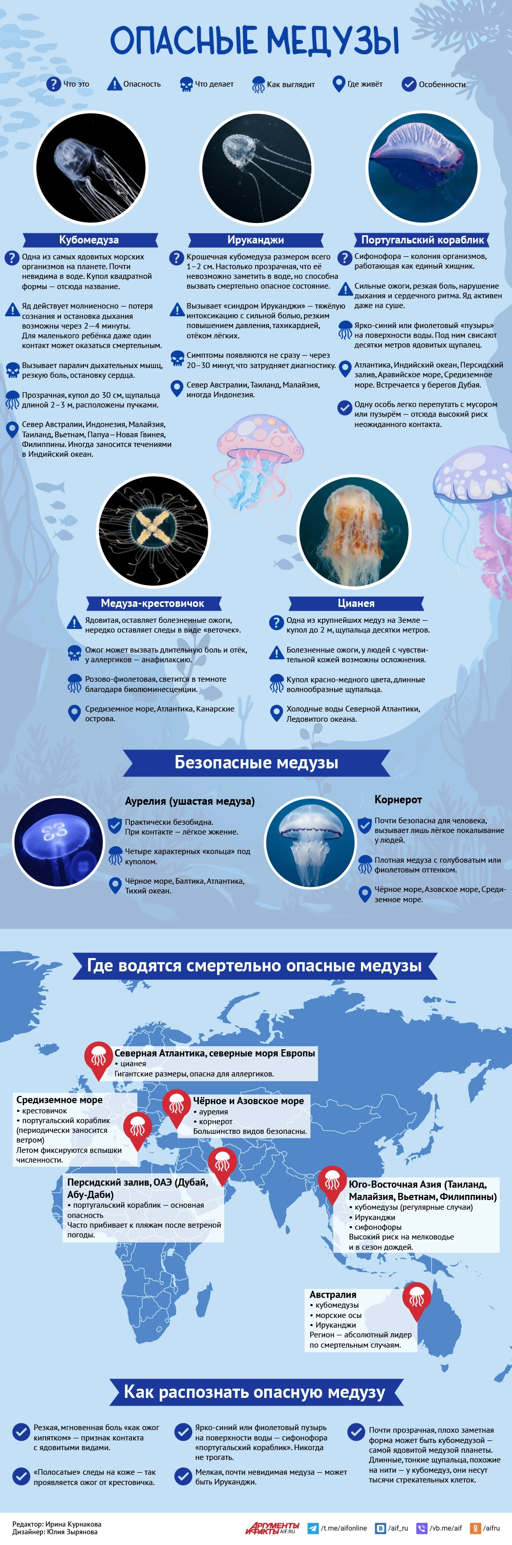 Ядовитые кубомедузы, почти невидимые ируканджи и «пузырь» португальского кораблика ежегодно становятся причиной ожогов и даже смерти туристов. Aif.ru собрал список самых опасных медуз и признаки, по которым их можно узнать в море.