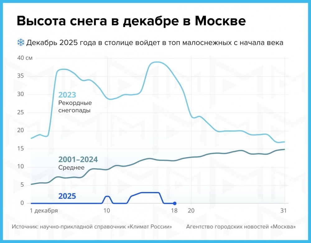 «И начало, и середина прошлой зимы были совершенно уникальными в Москве. В январе этого года среднемесячная температура была и вовсе положительной, впервые за весь период наблюдений. Если говорить про декабрь, то согласно новым нормам, высчитанным с 1991 по 2020 годы, среднемесячная температура месяца должна составлять -4,4 °C. Однако в декабре 2024 года она оказалась на отметке -2,1°C. Первые две декады декабря 2025 года экстремально теплые. Средняя температура пока примерно на 4 градуса выше нормы и держится в районе 0°C», — рассказал синоптик.