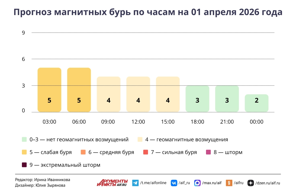 Прогноз магнитных бурь по часам на 1 апреля 2026 года. Инфографика