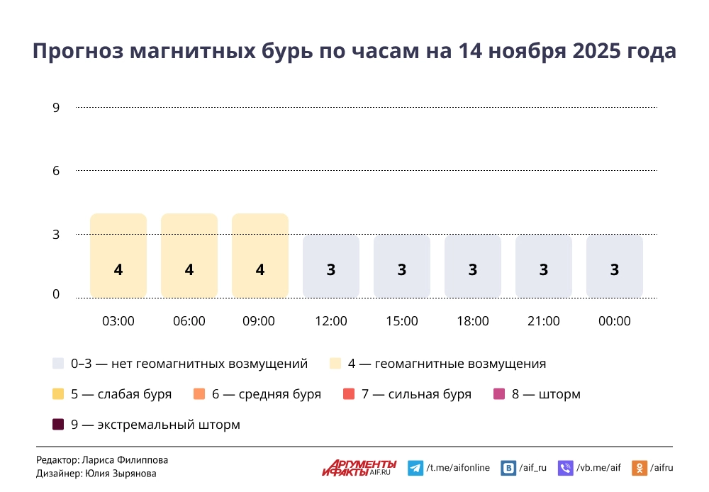 После двух дней самых сильных в 2025 году магнитных бурь, магнитосфера Земли придет в норму. 14 ноября 2025 года еще продолжатся геомагнитные возмущения, но после 9:00 геомагнитный фон стабилизируется. Почасовой прогноз магнитных бурь по московскому времени смотрите в инфографике aif.ru.