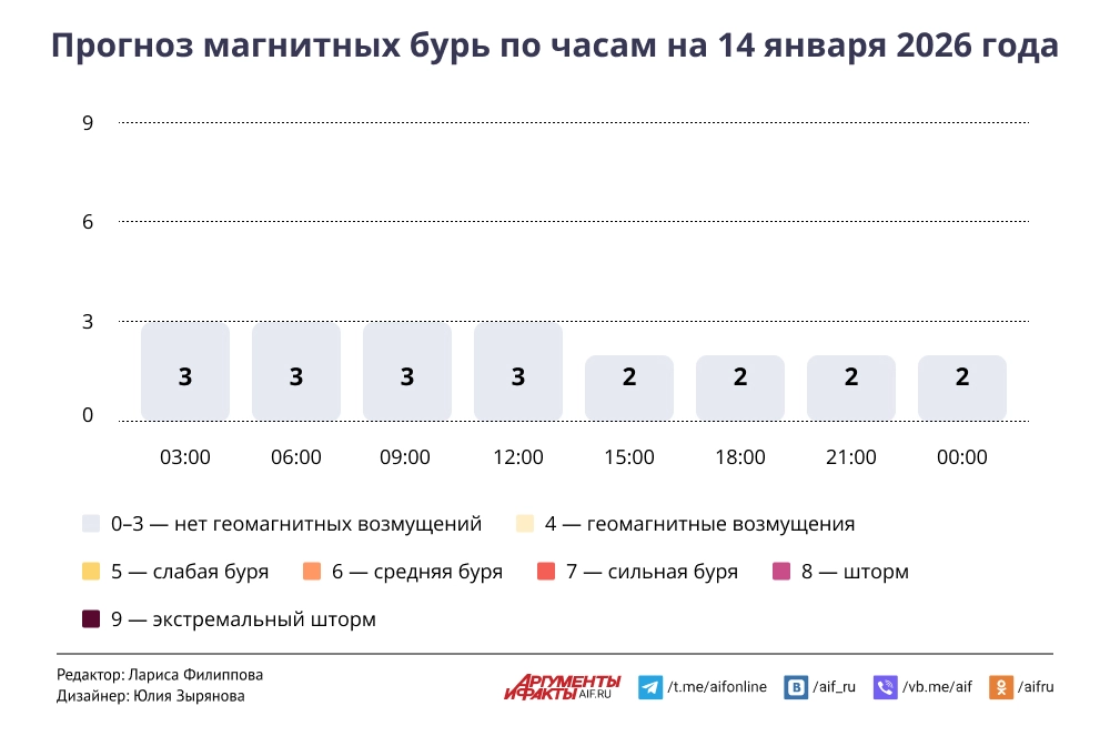 Прогноз магнитных бурь по часам на 14 января 2026 года. Инфографика