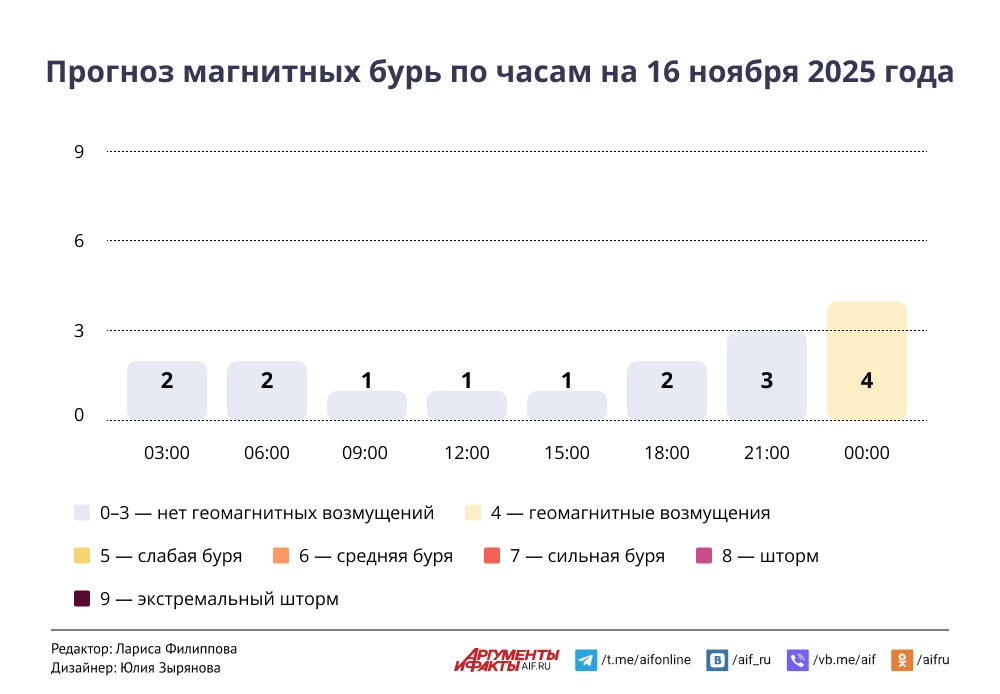 Почасовой прогноз магнитных бурь по московскому времени смотрите в инфографике aif.ru.