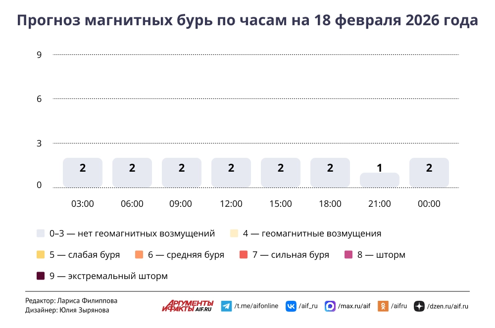 Прогноз магнитных бурь по часам на 18 февраля 2026 года. Инфографика