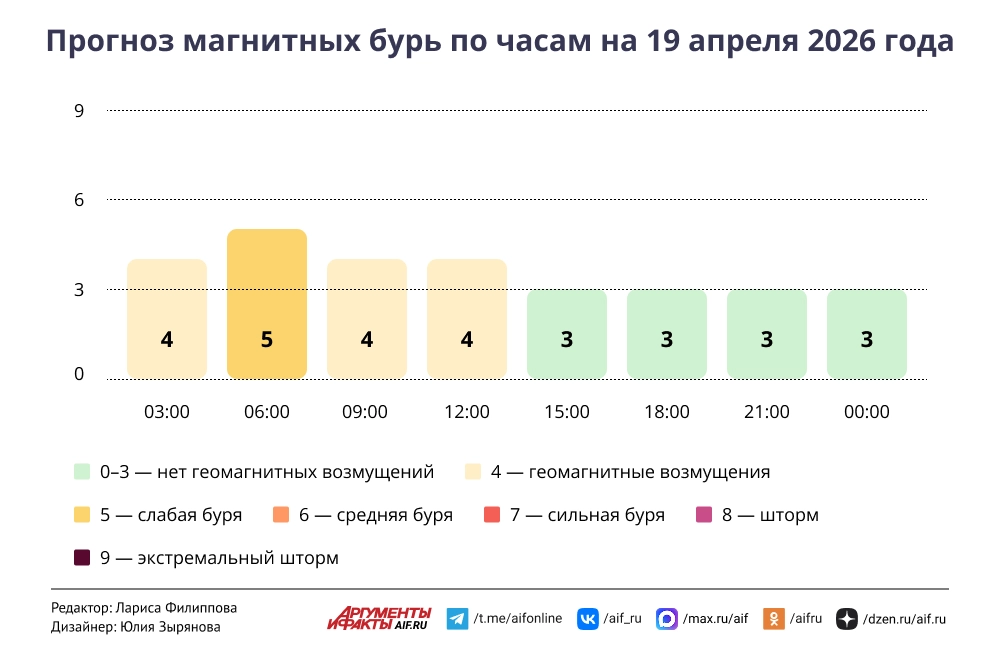 Прогноз магнитных бурь по часам на 19 апреля 2026 года. Инфографика