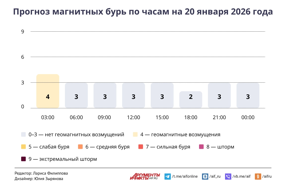 Прогноз магнитных бурь по часам на 20 января 2026 года. Инфографика