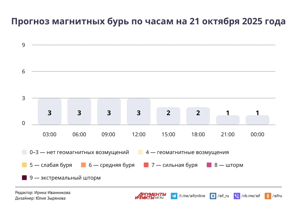 Прогноз магнитных бурь по часам на 21 октября 2025 года. Инфографика