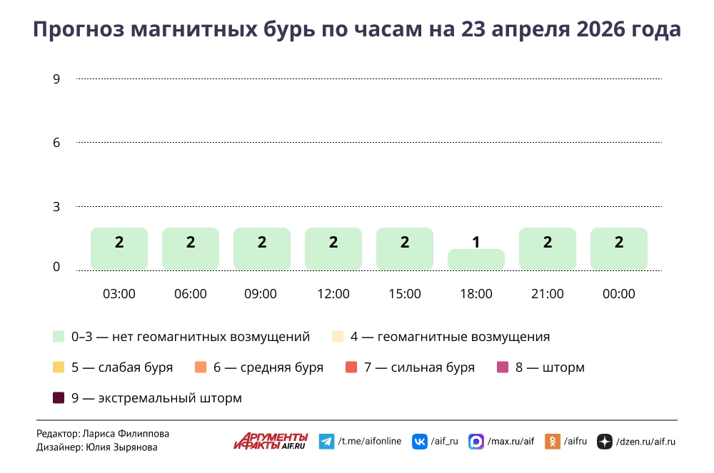 Прогноз магнитных бурь по часам на 23 апреля 2026 года. Инфографика