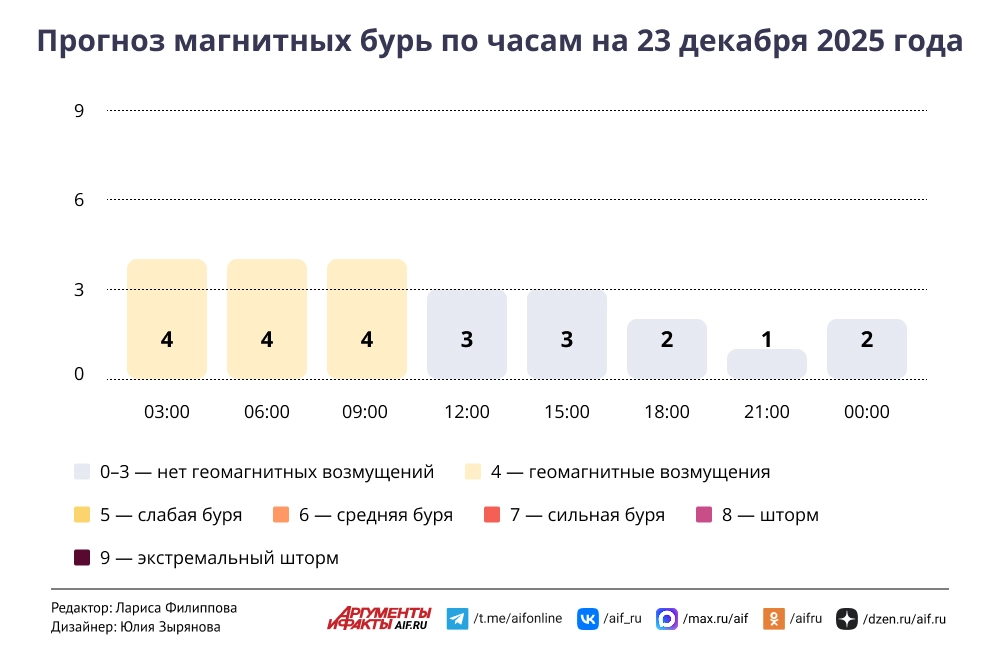 Прогноз магнитных бурь по часам на 23 декабря 2025 года. Инфографика
