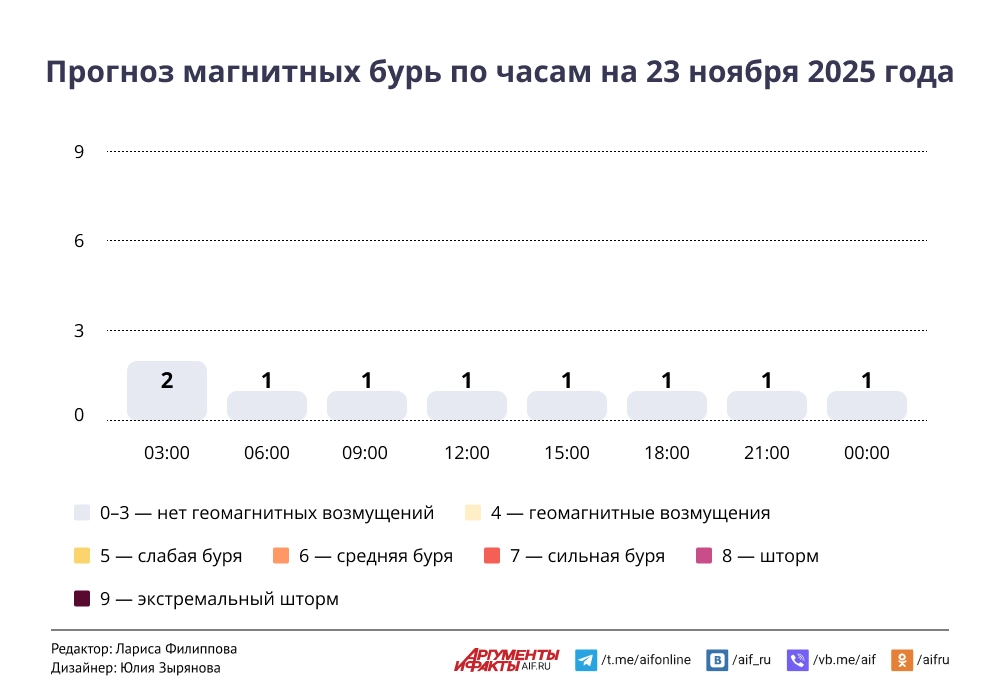 Прогноз магнитных бурь по часам на 23 ноября 2025 года. Инфографика