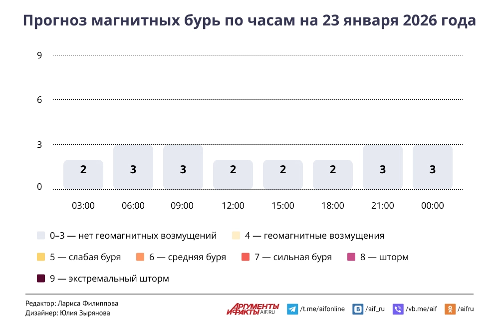 Прогноз магнитных бурь по часам на 23 января 2026 года. Инфографика