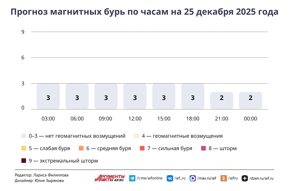 Прогноз магнитных бурь по часам на 25 декабря 2025 года. Инфографика