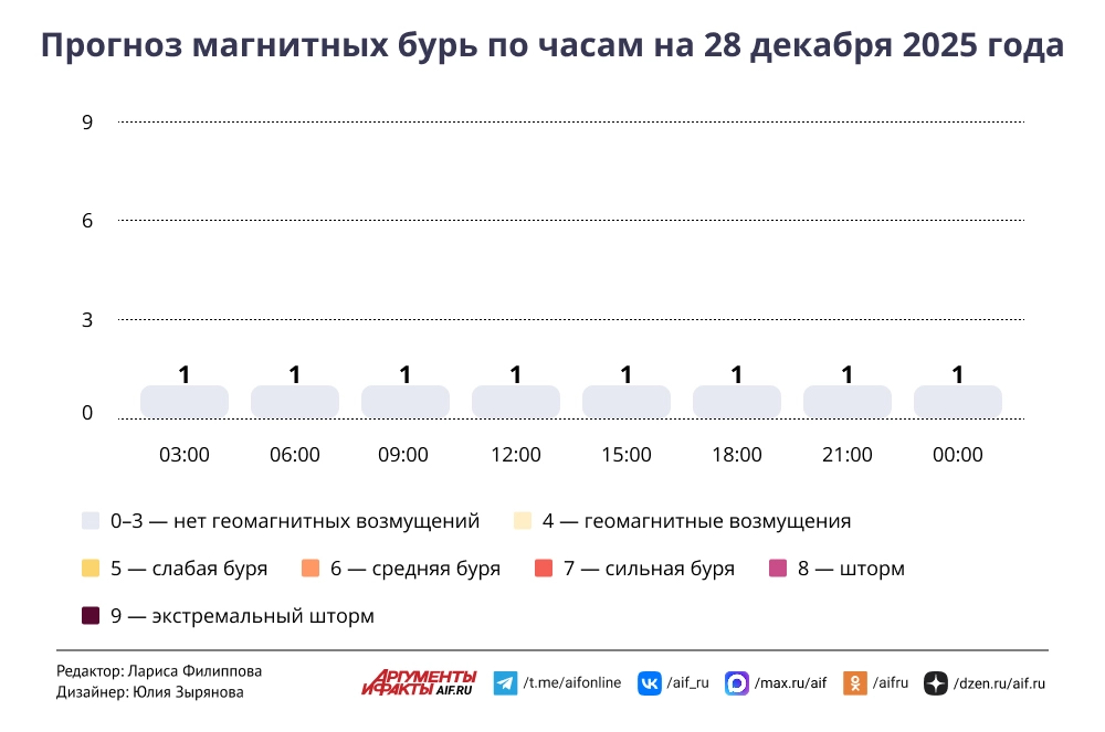 Прогноз магнитных бурь по часам на 28 декабря 2025 года. Инфографика