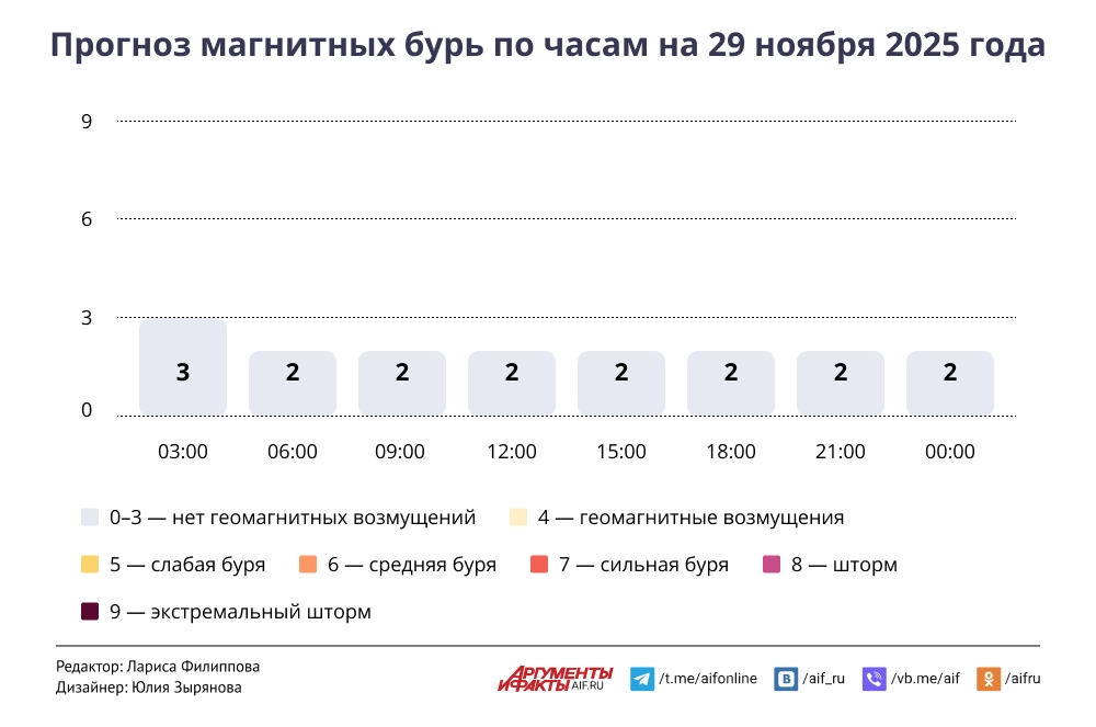 Прогноз магнитных бурь по часам на 29 ноября 2025 года. Инфографика