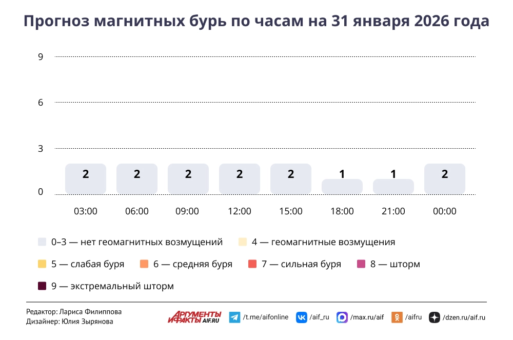 Прогноз магнитных бурь по часам на 31 января 2026 года. Инфографика