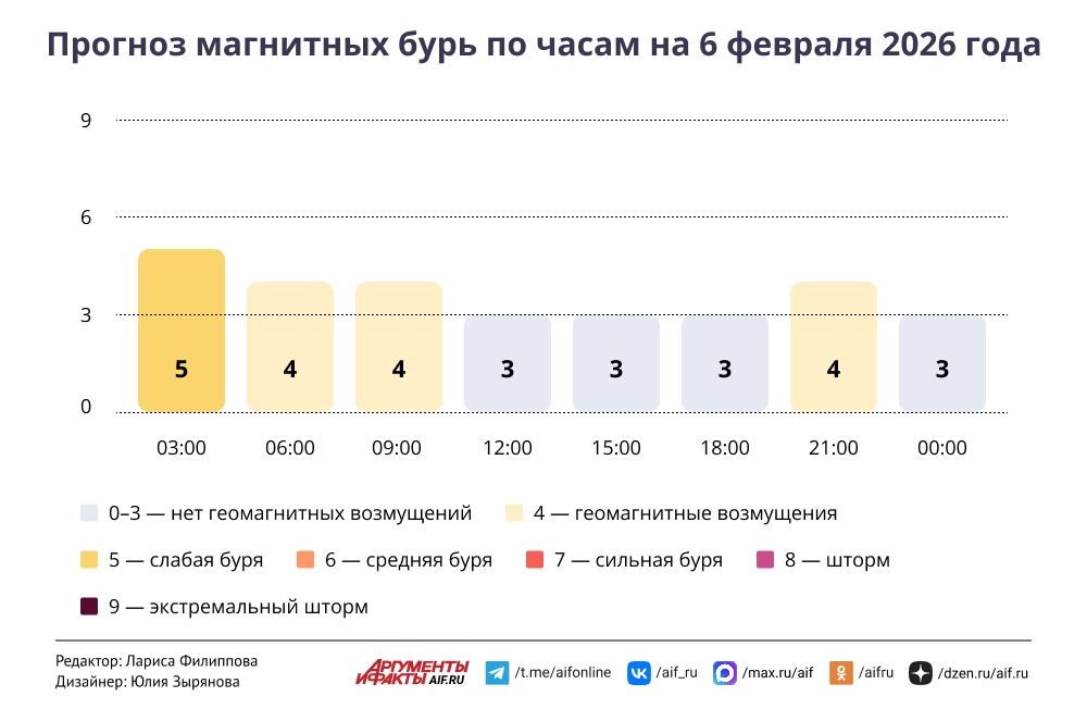 Прогноз магнитных бурь по часам на 6 февраля 2026 года. Инфографика