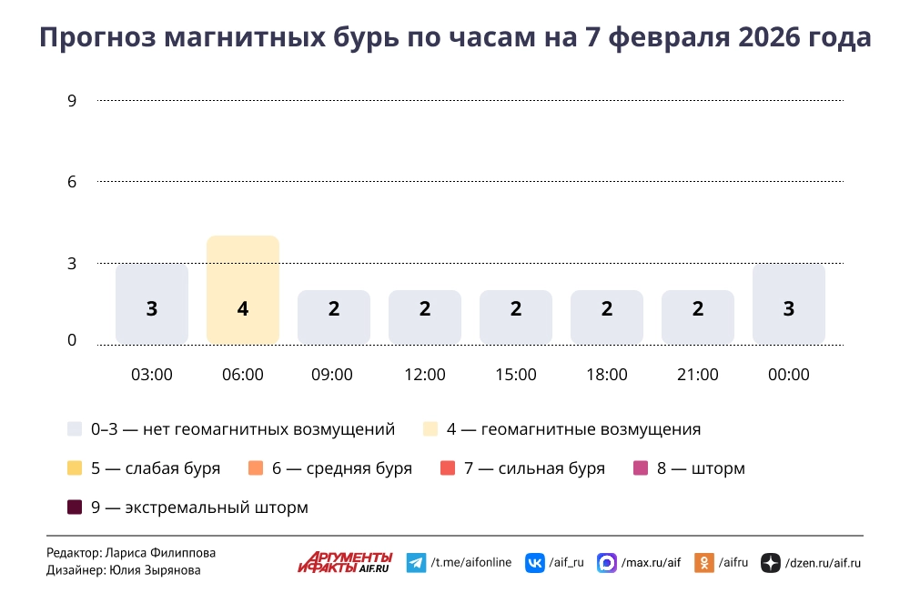 Прогноз магнитных бурь по часам на 7 февраля 2026 года. Инфографика