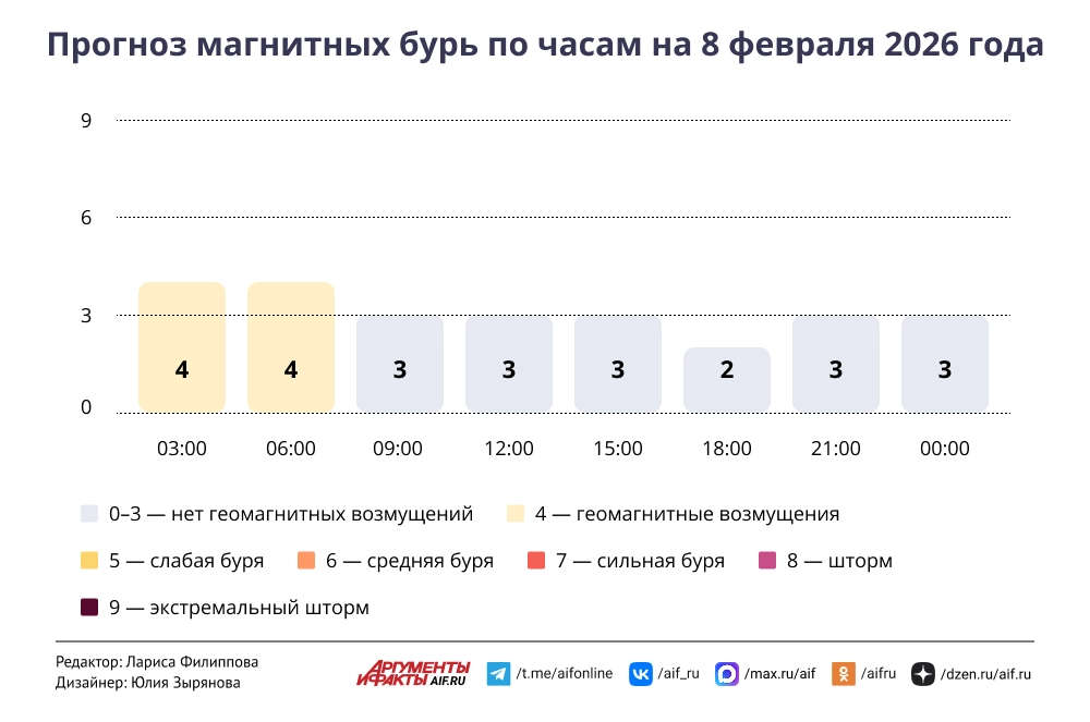 Прогноз магнитных бурь по часам на 8 февраля 2026 года. Инфографика