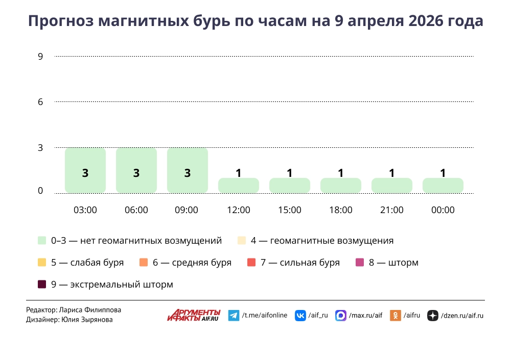 Прогноз магнитных бурь по часам на 9 апреля 2026 года. Инфографика