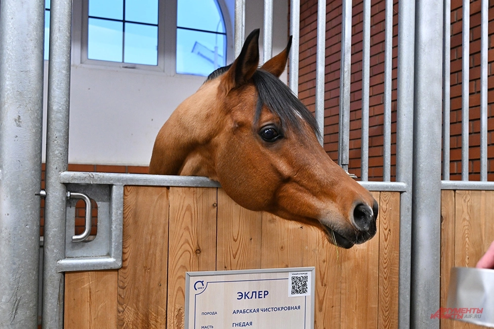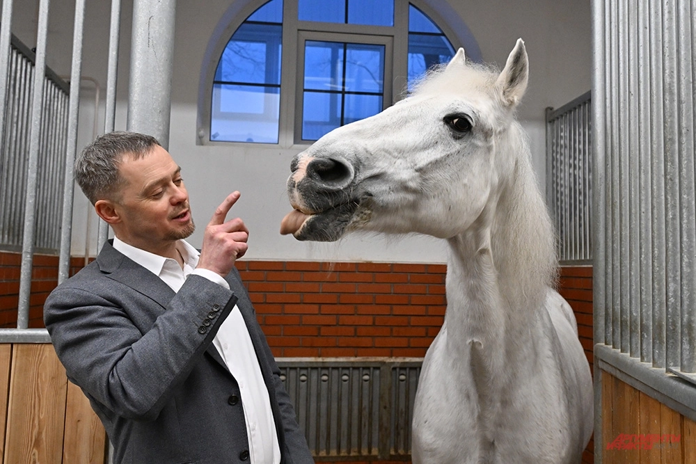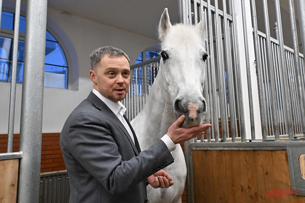 «Это чистокровный конь арабской породы, — объясняет Борис Петров. — Он является ярким представителем нашей выставочной конюшни. Вы знаете, что всего есть три чистокровных породы лошадей. Это арабская, ахалтекинская и английская чистокровная. Вот он яркий представитель арабских скакунов. Очень умный конь. Поражает всех своей красотой, артистизмом и очень человекоориентирован».
