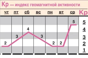 В среду ожидается магнитная буря (Кр 5), в субботу магнитосфера возмущённая (Кр 4). Людям с болезнями сердца и сосудов в эти и смежные дни надо тщательнее следить за здоровьем и строго соблюдать назначения врача.