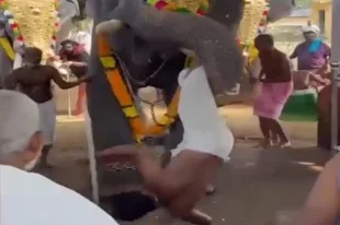В Индии во время фестиваля слон схватил священника хоботом и несколько раз ударил его об землю, появились жуткие кадры происшествия.