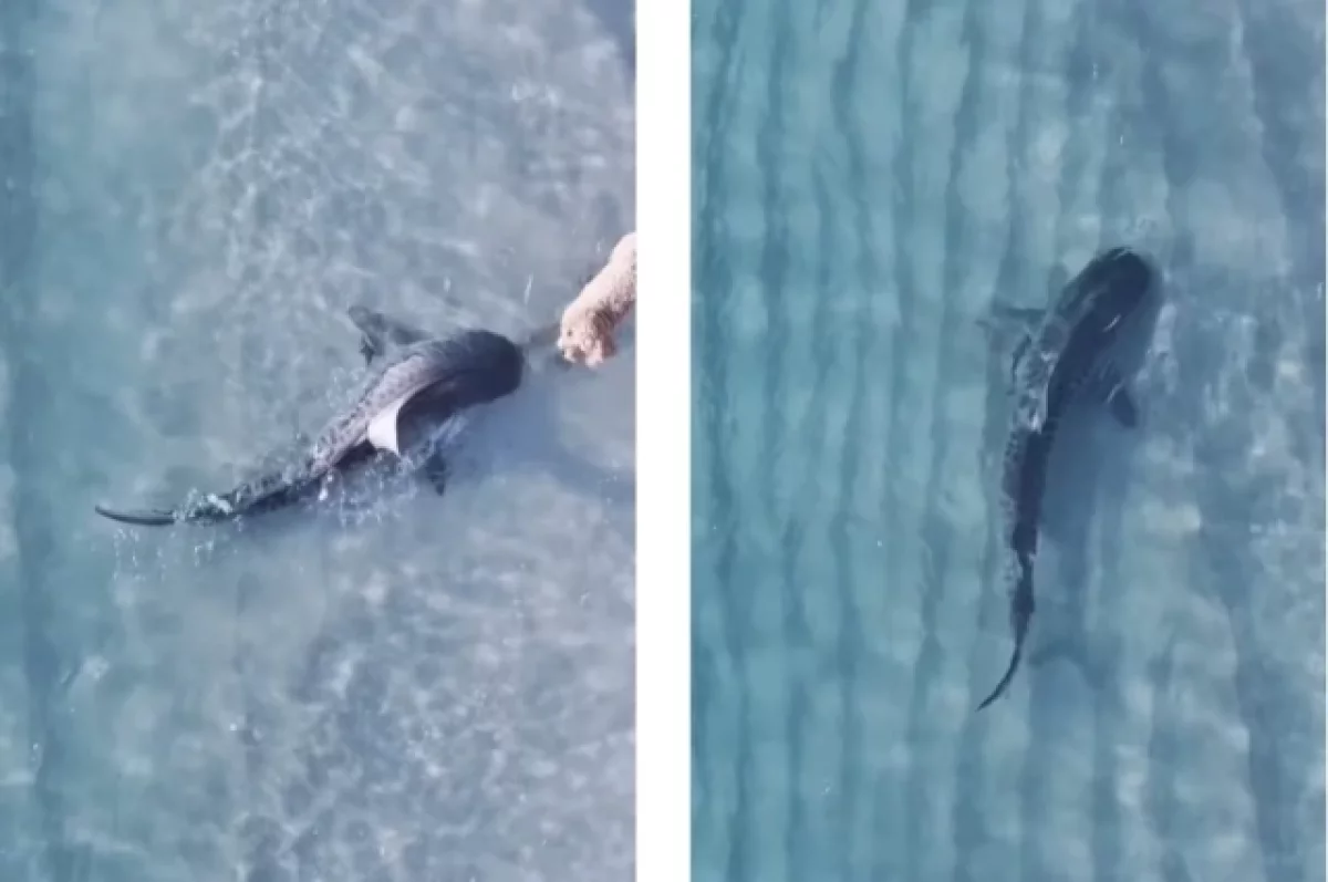Затем собака выбежала из воды, а акула развернулась и уплыла.
