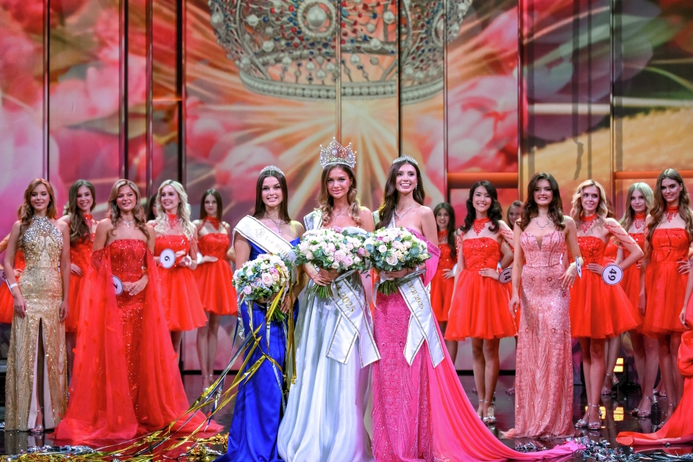 Алена Лесняк (Керчь), завоевавшая титул «Первая вице - мисс Россия 2025», Анастасия Венза (Московская область), завоевавшая титул «Мисс Россия - 2025», и Виктория Макарова (Сестрорецк), завоевавшая титул «Вторая вице-мисс Россия 2025», на финале национального конкурса. Фото: РИА Новости/ Владимир Астапкович