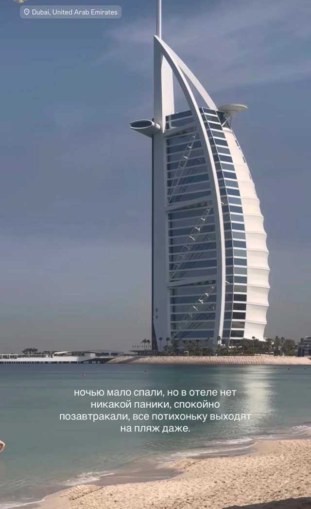«Мы остановились в скромном отеле на второй линии в Дубае, — говорит Антонина К. — Сейчас отель отменил все трансферы (в Дубай Молл, на пляж), предлагают сидеть в номере или в бассейне отеля. На пляж можно поехать только на такси (порядка 700 руб. в одну сторону), и то — на свой страх и риск. Сегодня мы были там, людей очень мало. Ощущения странные: заходишь в воду и слышишь взрывы, первая мысль: а куда бежать? Тут только песок и лежаки».
