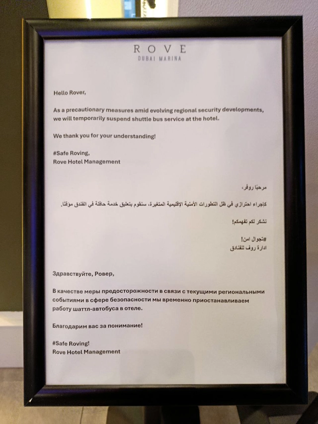 «Мы прилетели в дорогой отель буквально на три дня, на детские каникулы! Остановились на Джумейре, самой туристической локации, — говорит Ирина М. — Уже на следующий день в соседний с нами Fairmont прилетела ракета. В воскресение наше проживание закончилось, нас попросили освободить номер до 12:00. Туроператор отвечал, что вопрос решается, но надо подождать. С 12:00 до 18:00 мы просидели в лобби отеля с вещами. Потом нам разрешили вернуться в номер, который договорились продлить до завтра». Ирина рассказала: денег продлить номер в этом отеле у нее нет. Если надо будет переезжать за свой счет, подобрала скромную квартиру на сервисе бронирования, на третьей линии.