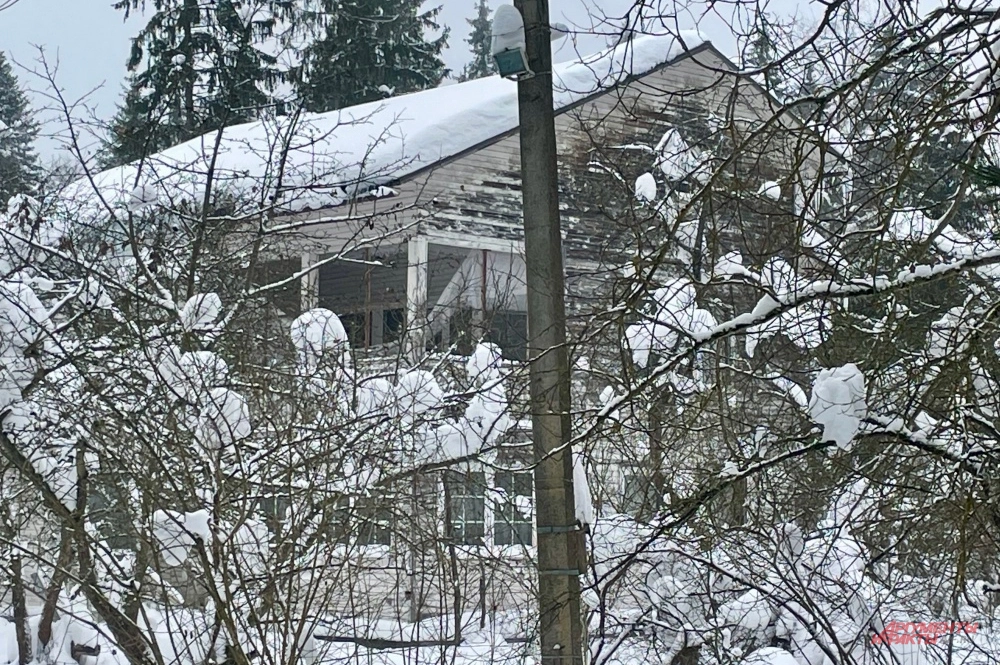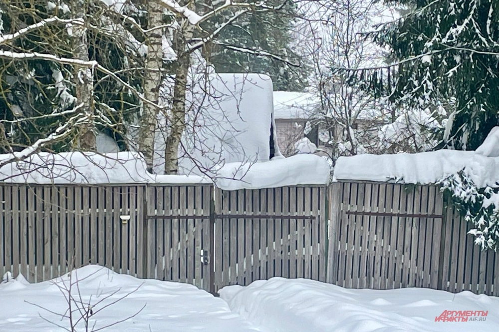 Видно, что в дом действительно кто-то заходит, но участок заметно обветшал. Фасад выцвел, замок заржавел, а дорожку до дома запорошило снегом. На том же участке расположен покосившийся сарай и пристройка с резными дверями. Может, баня. А может и «храм».
