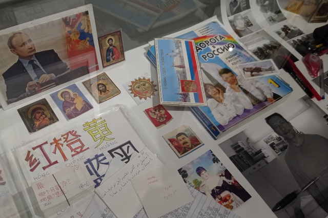 Портрет президента Владимира Путина, вырезанный из газеты, который висел на стене камеры Бута на протяжении всего срока. Несколько икон, карточки для написания иероглифов, теплые перчатки.
