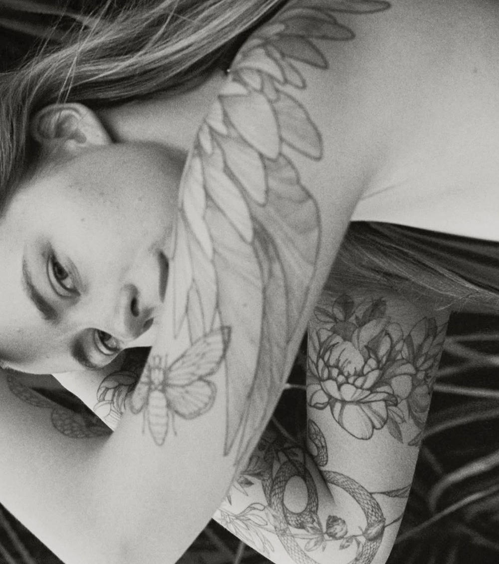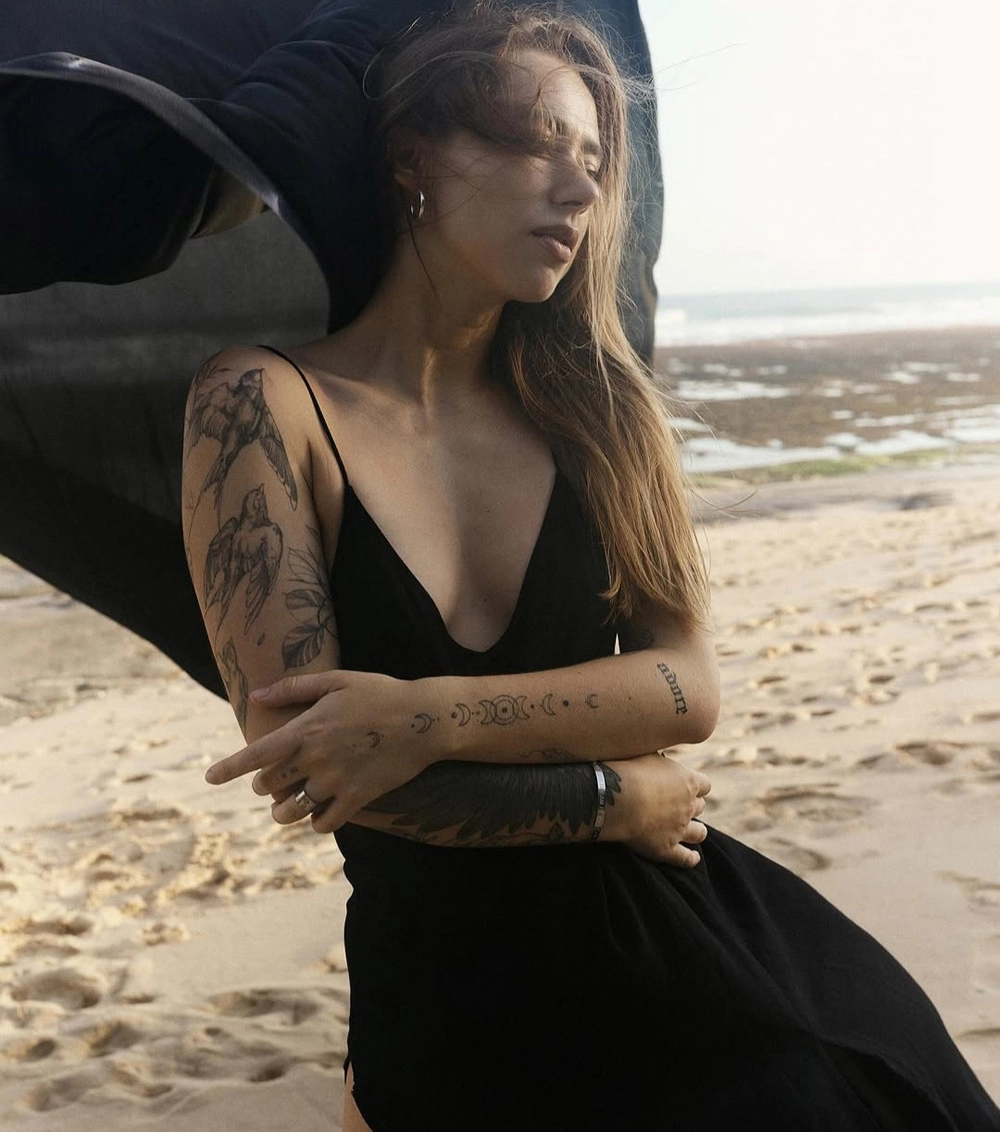 К качеству этой татуировки у мастера Валерии Серой есть вопросы. «У крыла, которое находится на руке, немного неравномерный покрас. На фоне остальных татуировок оно очень сильно выделяется, — рассказывает Валерия. — Дело в том, что все остальные работы очень минималистичные, а это темное пятно на теле, которое сразу бросается в глаза».